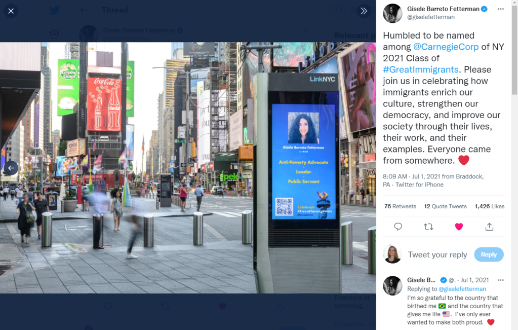 We also took steps to build out a more compelling messaging strategy. When I first began working on the campaign in 2019, I refocused the announcement to lift up and celebrate honorees’ stories, transforming flat bios into inspiring personal narratives. In 2020, I refined thatapproach by introducing an annual “theme” as a hook for media outreach and social media messaging. That year, we focused on immigrants involved in the Covid-19 response, including frontline medical personnel, but also journalists, educators, and the founder of Zoom. In 2021, we emphasized service to society, including elected officials, voting and disability rights advocates, and a member of the National Guard. We also added a street level digital advertising campaign that celebrated honorees throughout the five boroughs of New York City, with saturation along the East River waterfront to coincide with the post-pandemic resumption of fireworks on Independence Day. We photographed the ads running for each honoree in Times Square in advance of the announcement, enabling them to share the photos on social media, which they did enthusiastically.